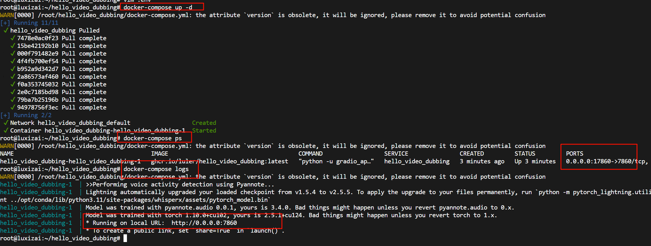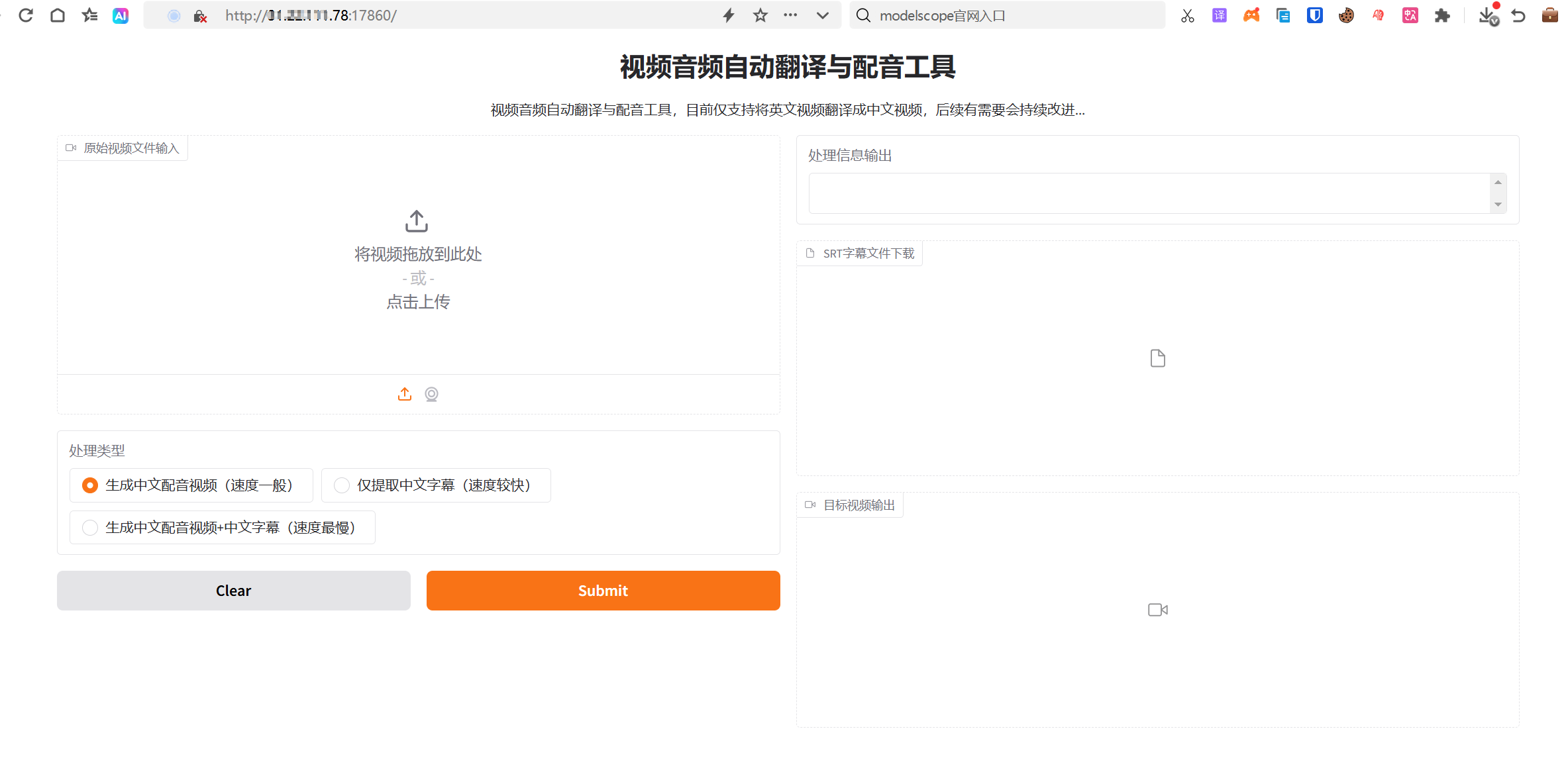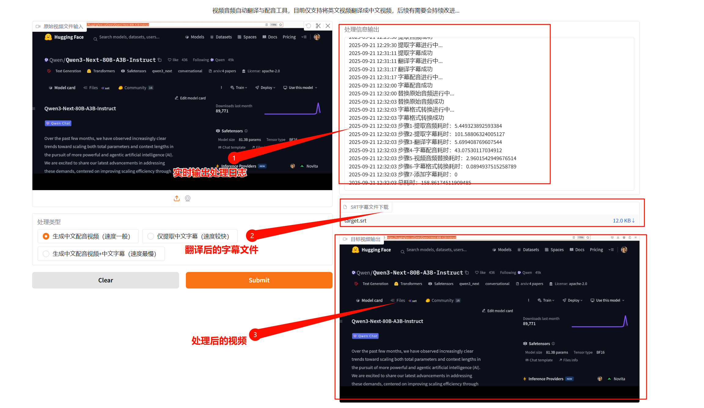 luler 一、简介 该工具是一个可以把将视频从一种语言翻译为另一种语言,同时支持语音识别转录、字幕翻译、语音合成 目前默认支持英文视频转录成中文视频(可以扩展更多语言) 提供Gradio图形界面,操作简单便捷 支持Docker快速部署启用 开源代码地址参考:https://github.com/luler/hello_video_dubbing 以下是这个工具的系统架构图 二、安装 准备一台主机,至少为2H4G的配置,可以是纯CPU,也可以配置GPU加速(可选) 提前安装好Docker、docker-compose软件运行环境 拉取项目代码 git clone https://github.com/luler/hello_video_dubbing.git 进入代码目录,编辑docker-compose.yml,配置内容参考如下 version: '3' services: hello_video_dubbing: image: ghcr.io/luler/hello_video_dubbing:latest # build: # context: . # dockerfile: Dockerfile restart: always ports: - 17860:7860 #查看主机端口17860是否被占用,占用则修改为其他 volumes: - .:/app 复制默认参考配置.env.example为.env,按需要修改相关配置 #翻译类型,默认是 google,可选 openai,选openai时需要配置openai接口兼容的模型服务 TRANSLATE_TYPE=google # 大语言模型翻译配置,当TRANSLATE_TYPE=openai才需要设置 OPENAI_BASE_URL=https://api.openai.com/v1 OPENAI_API_KEY=sk-xxx OPENAI_MODEL=gpt-xx #设置代理,如果主机在国内需要设置代理,因为白嫖的google翻译、tts语音服务只能外部网络可用 #http_proxy=http://127.0.0.1:10808 #https_proxy=http://127.0.0.1:10808 配置完成,可以直接执行如下命令启动服务,镜像拉取可能比较缓慢,请自行配置加速 docker-compose up -d 执行完成,查看服务是否正常运行,参考下图 三、使用 安装部署完成,可以访问地址:http://server_ip:17860/,可以看到一个gradio搭建的可视化界面,如下 接下来就是非常简单的操作了,点击上传视频、选择处理类型、提交处理 系统后台处理完成,实时输出处理日志,最终输出处理完毕的结果 四、总结 这是一个简易的视频语言转录工具,方便将视频从一种语言翻译为另一种语言,有助于目标语言用户观看、学习和理解视频内容 运行部署要求低,CPU/GPU均可运行,支持Docker快速部署启动 配置简单、低依赖,翻译、配音等组件均采用免费方案,也支持通过大语言模型来优化翻译结果(建议) 提供gradio可视化操作界面,可以远程在线使用