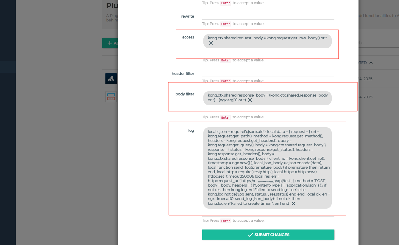 local cjson = require('cjson.safe'); local data = { request = { uri = kong.request.get_path(), method = kong.request.get_method(), headers = kong.request.get_headers(), query = kong.request.get_query(), body = kong.ctx.shared.request_body }, response = { status = kong.response.get_status(), headers = kong.response.get_headers(), body = kong.ctx.shared.response_body }, client_ip = kong.client.get_ip(), timestamp = ngx.now() }; local json_body = cjson.encode(data); local function send_log(premature, body) if premature then return end; local http = require('resty.http'); local httpc = http.new(); httpc:set_timeout(5000); local res, err = httpc:request_uri('https://log.xxx.top/api/log', { method = 'POST', body = body, headers = { ['Content-Type'] = 'application/json' }, ssl_verify = false }); if not res then kong.log.err('Failed to send log: ', err) else kong.log.notice('Log sent, status: ', res.status) end end; local ok, err = ngx.timer.at(0, send_log, json_body); if not ok then kong.log.err('Failed to create timer: ', err) end